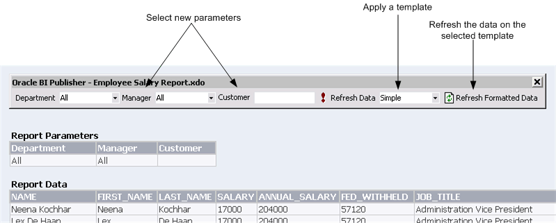 If the report has parameters, the parameter names will appear at the top of the sheet, but you must log in to apply new parameter values. See Using the Oracle BI Publisher Menu.