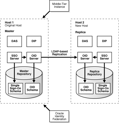 You have an original Identity Management (also called the Master) used by one or more middle-tier instances. The Identity Management instance has a Metadata Repository. You install and set up a new Identity Management (also called the Replica). This Identity Management instance has its own Metadata Repository. The Oracle Internet Directory in the new Identity Management is an LDAP-based replica of the original Oracle Internet Directory. Replication takes place constantly from the original Oracle Internet Directory to the new Oracle Internet Directory.