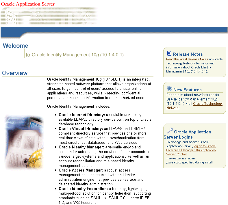 The Oracle Application Server Welcome Page is a great starting point for managing your application server. It includes the following: