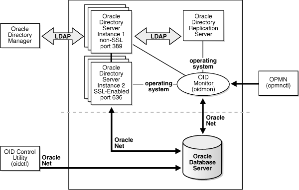 The Oracle directory replication server uses LDAP to communicate with an Oracle directory (LDAP) server instance. To communicate with the database, all components use OCI/Oracle Net Services. Oracle Directory Manager and the command-line tools communicate with the Oracle directory servers over LDAP.