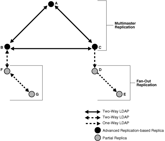 Oracle Internet Directory enables any node in a multimaster replication group to also participate in an LDAP-based replication agreement. The node it connects to using LDAP can, in turn, supply data to other nodes in a fan-out configuration. Within the multimaster replication agreement, data transfer between the nodes occurs by way of Oracle Database Advanced Replication. Within the fan-out replication agreement, data transfer from supplier to consumer occurs by way of LDAP. The LDAP replication agreements can be either one-way or two-way.