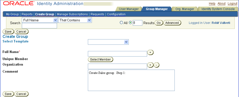 You query for users or groups by filling in the search criteria and clicking Go. Optionally, you can store the results of a query by clicking the Reports tab and selecting Generate Report. Oracle Access Manager uses a locale-based case insensitive sorting method when you click the column heading (Full Name, for example) in the search results table.