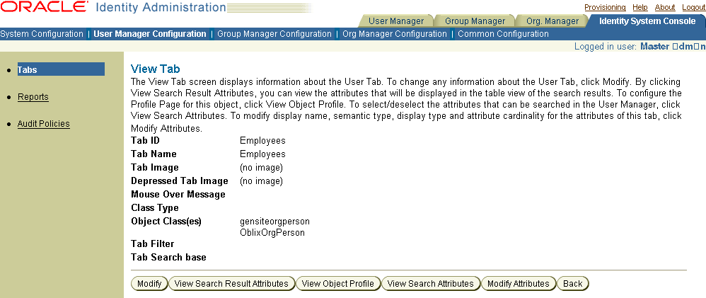 From the Identity System Console, click User Manager Configuration (or Group Manager Configuration or Org. Manager Configuration), and click the Tabs link in the left navigation pane.