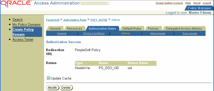 If the credentials are validated, Oracle Access Manager executes the actions defined in the security policy for the PeopleSoft resource and sets a HTTP Header variable that maps to the PeopleSoft user ID.