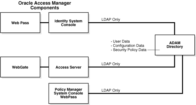 With ADAM, policy data may be stored with user and Oracle Access Manager configuration data. Alternatively, Oracle Access Manager supports separate ADAM instances for configuration, user and policy data.