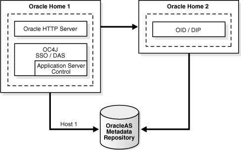 Two Oracle Homes, one containing Oracle HTTP Server, OracleAS Single Sign-On, and Oracle Delegated Administration Services. and the other containing Oracle Internet Directory and Oracle Directory Integration Platform. |