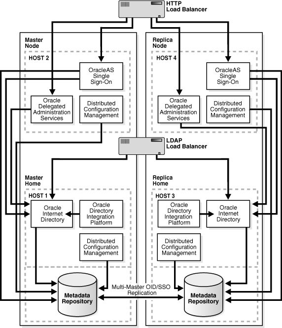 Figure A-1 shows a typical Oracle Identity Management 10g Release 2 (10.1.2) multimaster replication environment, which is described in detail in "Deploying Identity Management with Multimaster Replication," in the 10g Release 2 (10.1.2) Oracle Application Server High Availability Guide.