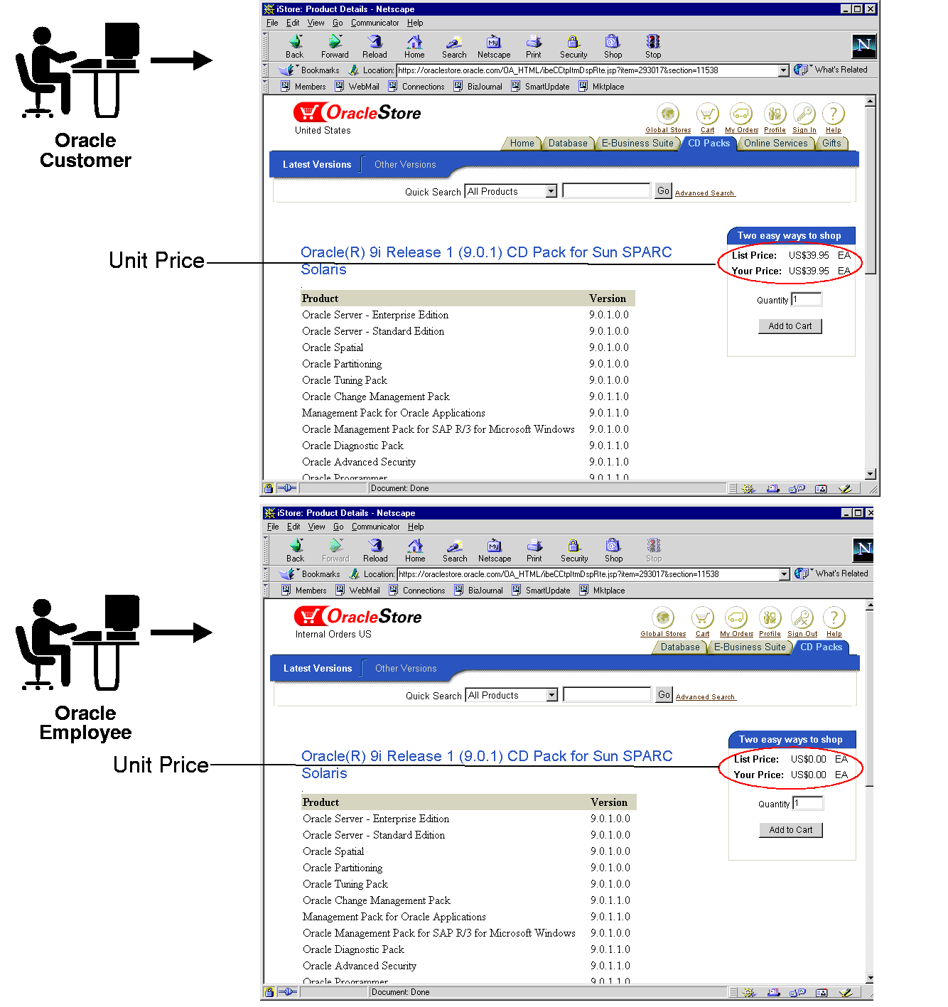Some pages have multiple versions, enabling categorization. Figure 2-4 shows the same document, https://oraclestore.oracle.com/OA_HTML/ibeCCtpItmDspRte.jsp?item=293017§ion=11538, with different prices for customers and internal Oracle employees. While customers pass a cookie name and value of ec-400-id-acctcat=WALKIN, employees pass a cookie name and value of ec-400-id-acctcat=INTERNAL.