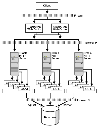 Sometimes it is desirable to separate Oracle HTTP Server from OC4J (the application server component) into different security zones. This scenario is shown in the following Figure 12-5.